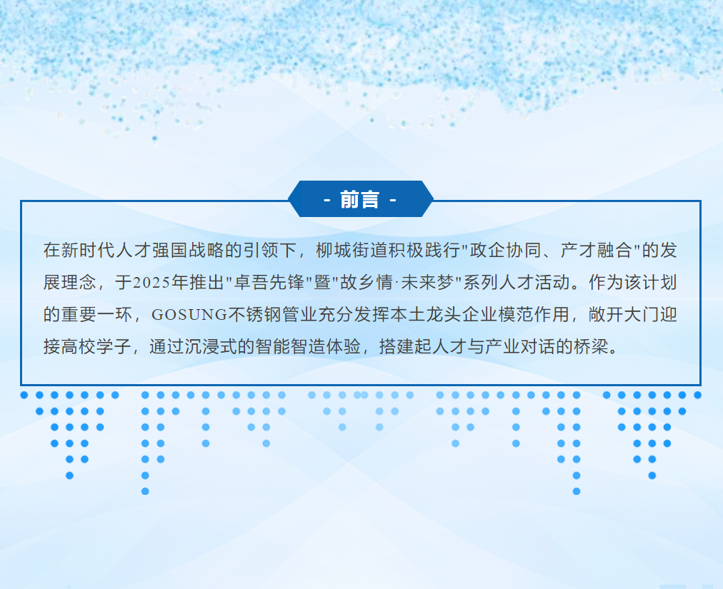 作為柳城街道“卓吾先鋒”活動(dòng)的參與企業(yè),GOSUNG不銹鋼管業(yè)始終重視與高校的互動(dòng)合作,積極為青年學(xué)子提供實(shí)踐機(jī)會(huì)和職業(yè)引導(dǎo)。此次參觀活動(dòng)不僅讓學(xué)子們近距離接觸了先進(jìn)制造工藝,也讓他們感受到家鄉(xiāng)企業(yè)的發(fā)展活力。